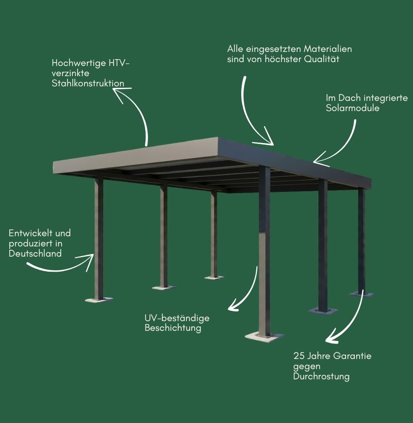 Mit einem erweiterbaren System und 25 Jahren Garantie gegen Durchrostung steht der greenCarport für eine langlebige, anpassungsfähige und technisch durchdachte Lösung.