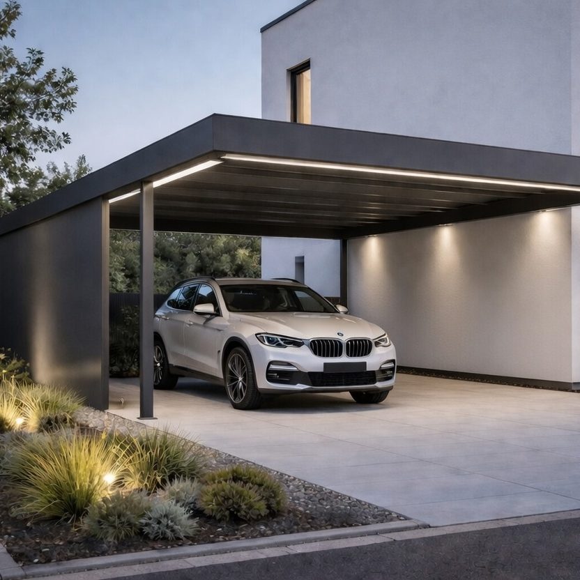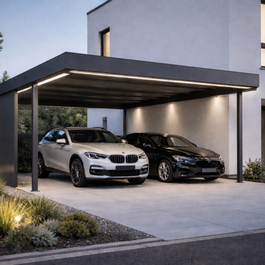 Die Konstruktion basiert auf einem modularen System, das bei veränderten Bedürfnissen erweitert werden kann. Zusätzliche Stellplätze oder eine vergrößerte Dachfläche lassen sich strukturell integrieren. So entsteht kein Standard-Carport, sondern ein flexibles System mit langfristiger Perspektive.